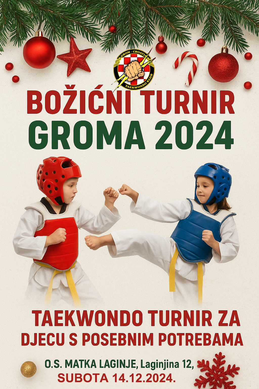 Dana 14.12.2024. godine u OŠ Matko Laginja održalo se prijateljsko taekwondo natjecanje „BOŽIĆNI KUP GROMA 2024“ mlađih dobnih skupina te skupina djece sa posebnim potrebama (ADHD, epilepsija i Downow sindrom) te kroničnim bolestima. Ovo natjecanje organizirano je sa željom približavanja taekwondo sporta djeci sa posebnim potrebama koja pohađaju treninge i o kojima uz ostale brine i naš klub kroz svakodnevni rad te djeci mlađih dobnih skupina. Cilj nam je upoznati ih sa ljudskom potrebom za gibanjem i zdravim životom. Projekt natjecanja „BOŽIĆNI KUP GROMA 2024“izveden je po projektnoj dokumentaciji taekwondo kluba „GROM CROATIA“.